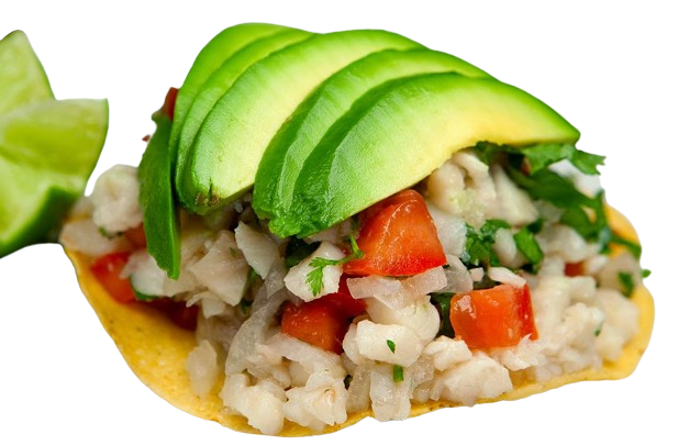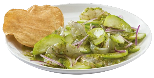 Camarón y pezcado curtido en limón bañado en salsa de serranito, acompañado de vegetales y aguacate.